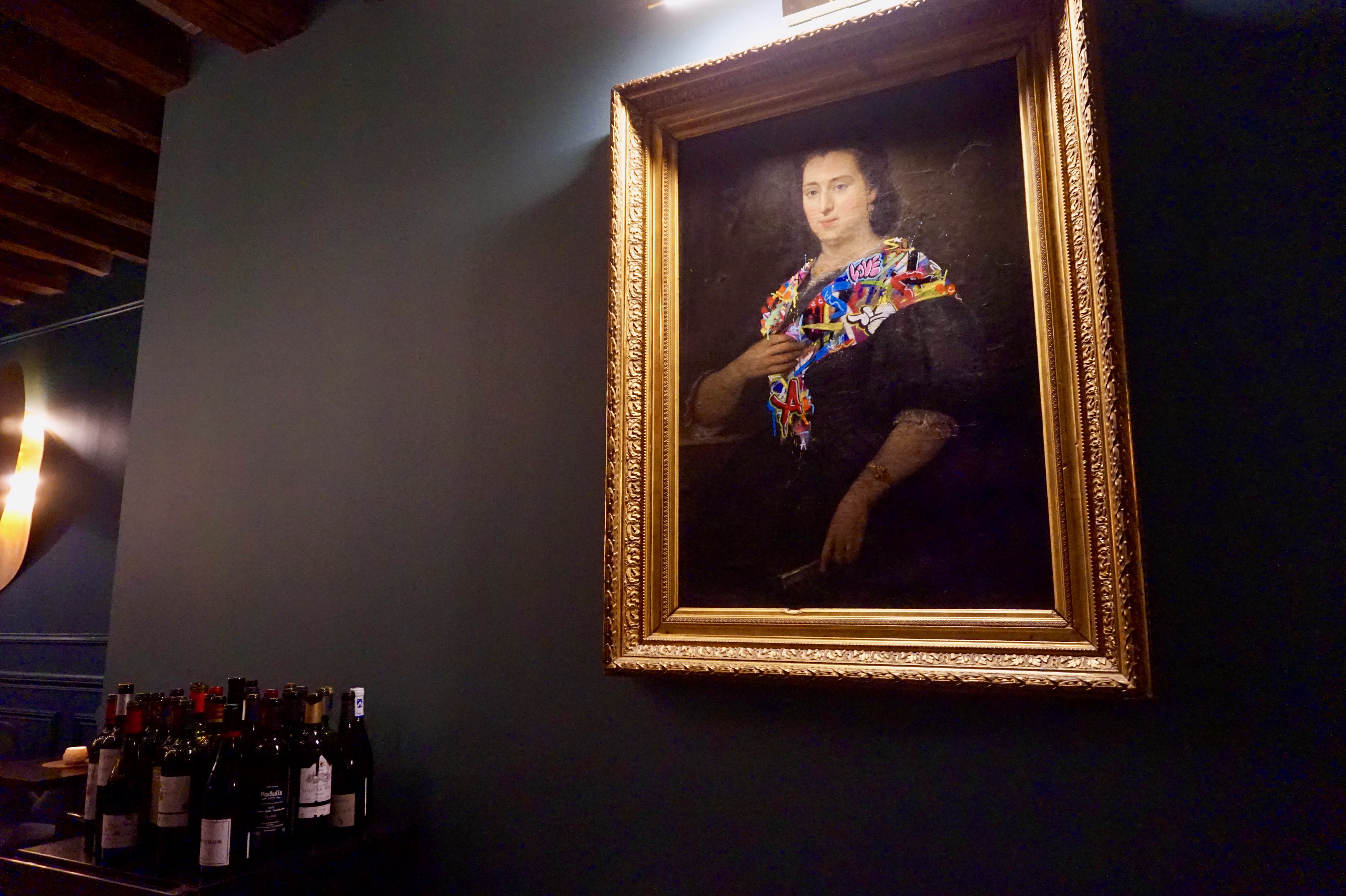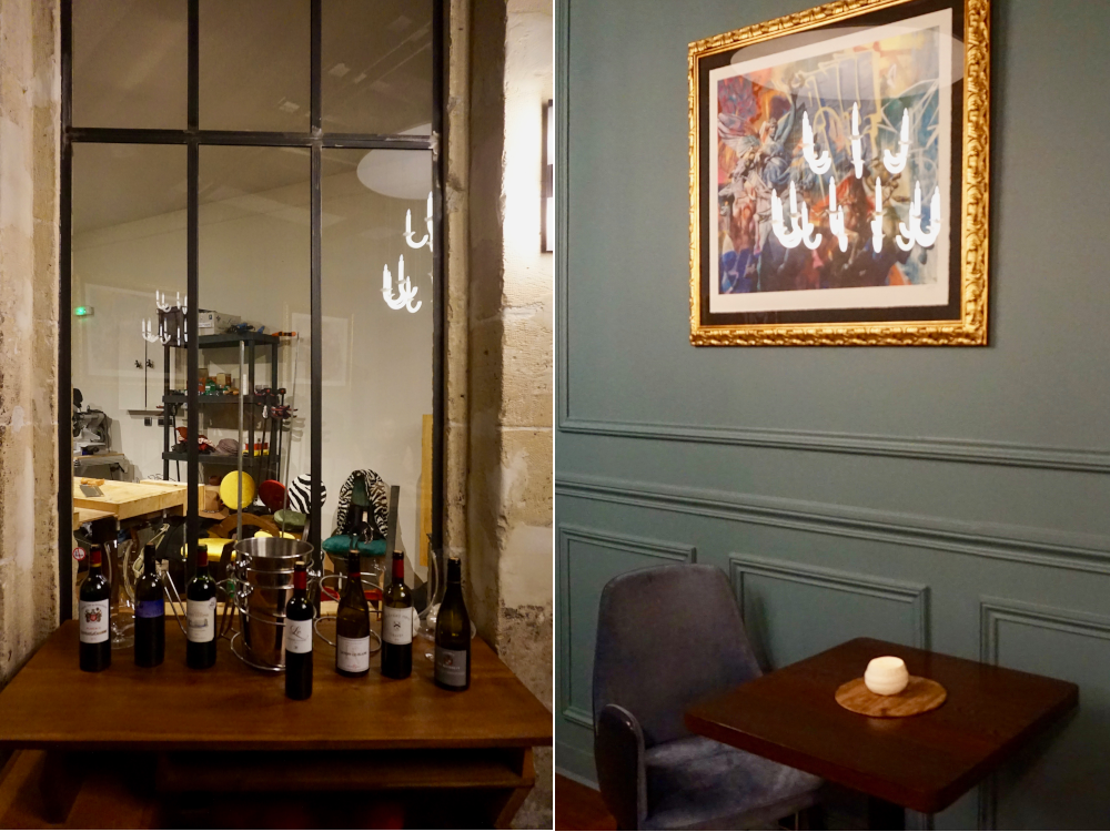 En face de l’atelier d’art du propriétaire, un escalier nous invite à descendre au sous-sol pour découvrir un lieu historique comme on en voit peu à Paris. Dans cette cave voûtée en pierres de taille, faite de petites alcôves tamisées et intimes, on ne rêve de se blottir dans l’un des fauteuils moelleux pour déguster l’une de bouteilles proposées à la carte.