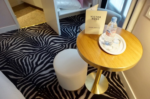 Le sol zébré et graphique vous fera certainement penser aux motifs appréciés par Christian Lacroix ou Jean-Paul Gauthier. De même, l’esprit noir et blanc, le tweed des housses de coussin où les bouteilles de parfum dessinées sur les portes pour révéler le numéro des chambres rappellent évidement la maison Chanel. Enfin, le tableau style papier peint s’imagine très bien sur un joli carré Hermès. Amusez-vous à rechercher dans votre chambre ces touches astucieuses rendant hommage à la mode parisienne, il y en a tant d’autres encore.